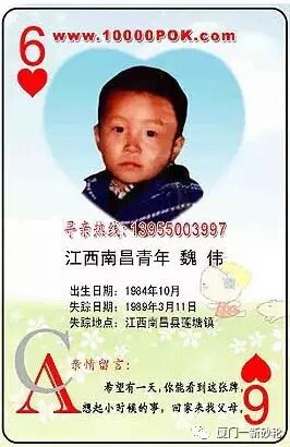 厦门一新砂轮有限公司大型公益活动 【宝贝回家吧】 为了支持公益事业,本公司投入了大量财力物力,印刷了寻子扑克,免费发放,并为公益坚持了10年。目前通过本平台,已经帮助多个家庭,让他们重新有了团聚的欢笑。 魏伟 我找到我的家了 魏伟,男,1984年出生,江西省南昌市人。1989年4月失踪。2006年3月,家长加入寻子扑克计划。该男孩成为寻子扑克公益第4版红桃6。2008年10月,该男孩在福建被找到。 愿每个走失的宝贝都能找到自己的家 让宝贝早日回家 您的一个小小的举动 也许能让一个家庭早日团圆 ·END· 联系方式:李小姐 0592-7111588 |